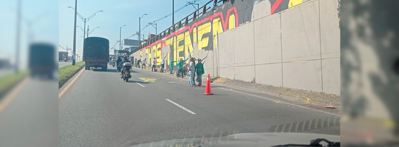 Y es que resulta que hace unas dos semanas, empleados de la actual Administración, que hacen parte de las jornadas de aseo y ornato, taparon la frase con pintura gris, pero los artistas no se quedaron de brazos cruzados y nuevamente la volvieron a pintar.