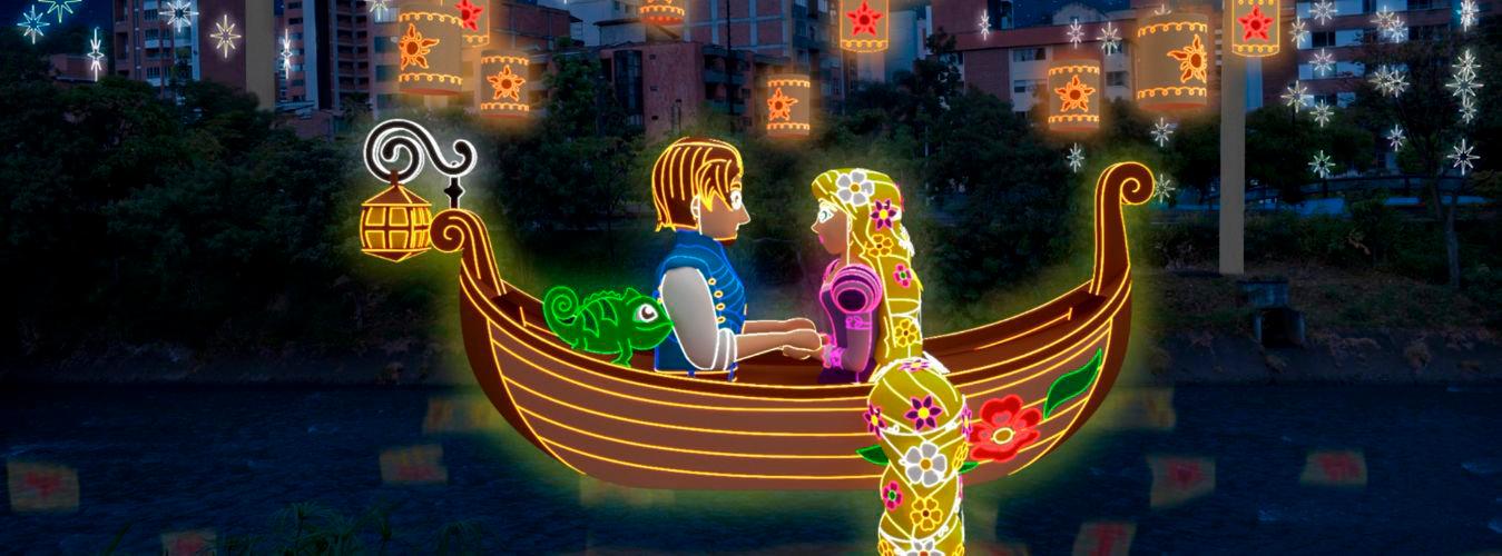 Los alumbrados en su edición 56, que llevan por nombre ‘Celebremos una Navidad Mágica’, en su nodo principal ubicado en el Paseo del río y Parques del río, están inspirados en el aniversario número 100 de Disney. Allí se pueden encontrar los personajes clásicos de Walt Disney Animation Studios, y de la película ‘Wish: el poder de los deseos’ de Disney.