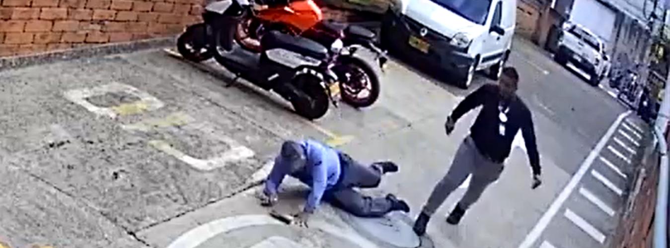 En imágenes de la cámaras de seguridad, difundidas por la Alcaldía de Itagüí, se puede ver cuando el vigilante persigue al sujeto tratando de evitar que siga avanzando, ante lo que este lo empuja fuertemente, por lo que pierde el equilibrio y cae al piso.