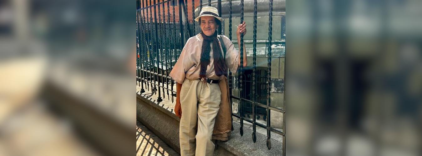El hombre viste casi siempre igual: sombrero, pantalón ancho y camisa. Carga consigo un bolso en el que guarda sus cartas y paraguas en caso de que lo coja la lluvia.