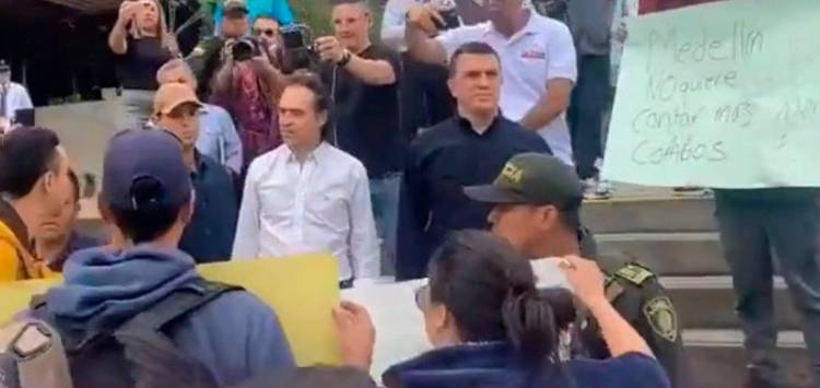 “Ni un solo voto para ladrones de Hidroituango”, “lazarillo del Matarife”, se lee en algunos carteles. Además, le gritaban frases como: “los jóvenes en Medellín no te quieren”, “estamos cansados de escuchar a las personas como usted”, decía uno de los jóvenes.