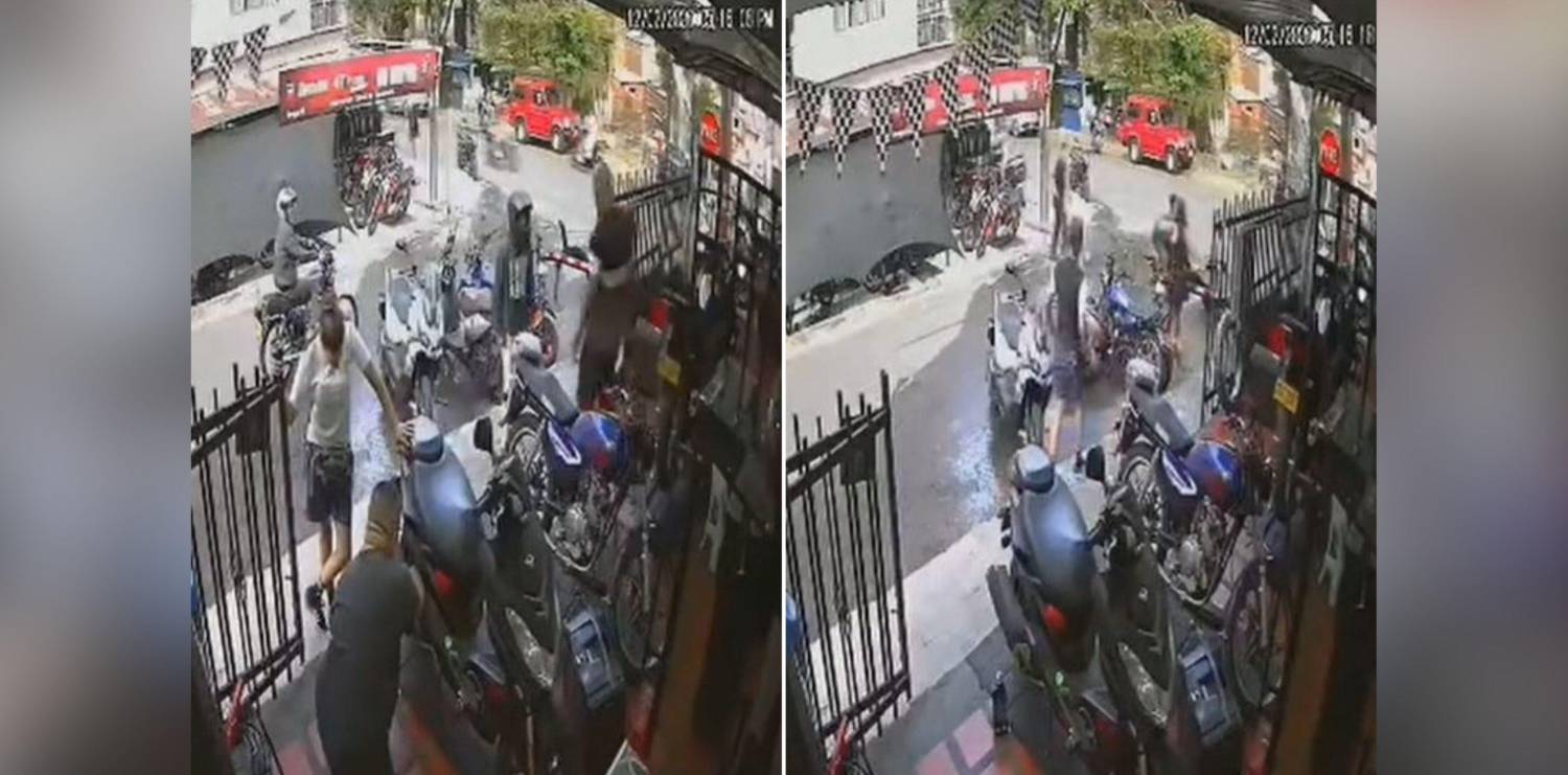 El video también deja que ver el parrillero de la moto se bajó, se acercó al negocio y conversó con un hombre que salió del lugar. En ese momento el extranjero, quien siempre mantuvo el casco puesto, intentó sacar algo del pantalón, pero el hombre reaccionó, lo empujó contra otras motos y lanzó al suelo. Allí se desató un altercado al que se unieron otras personas.