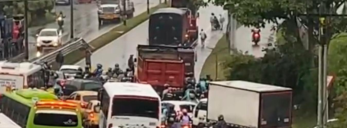 En otro video publicado en redes sociales, se logró observar el trancón que generó esta protesta, donde motocicletas, taxis, buses y particulares quedaron en medio del bloqueo.