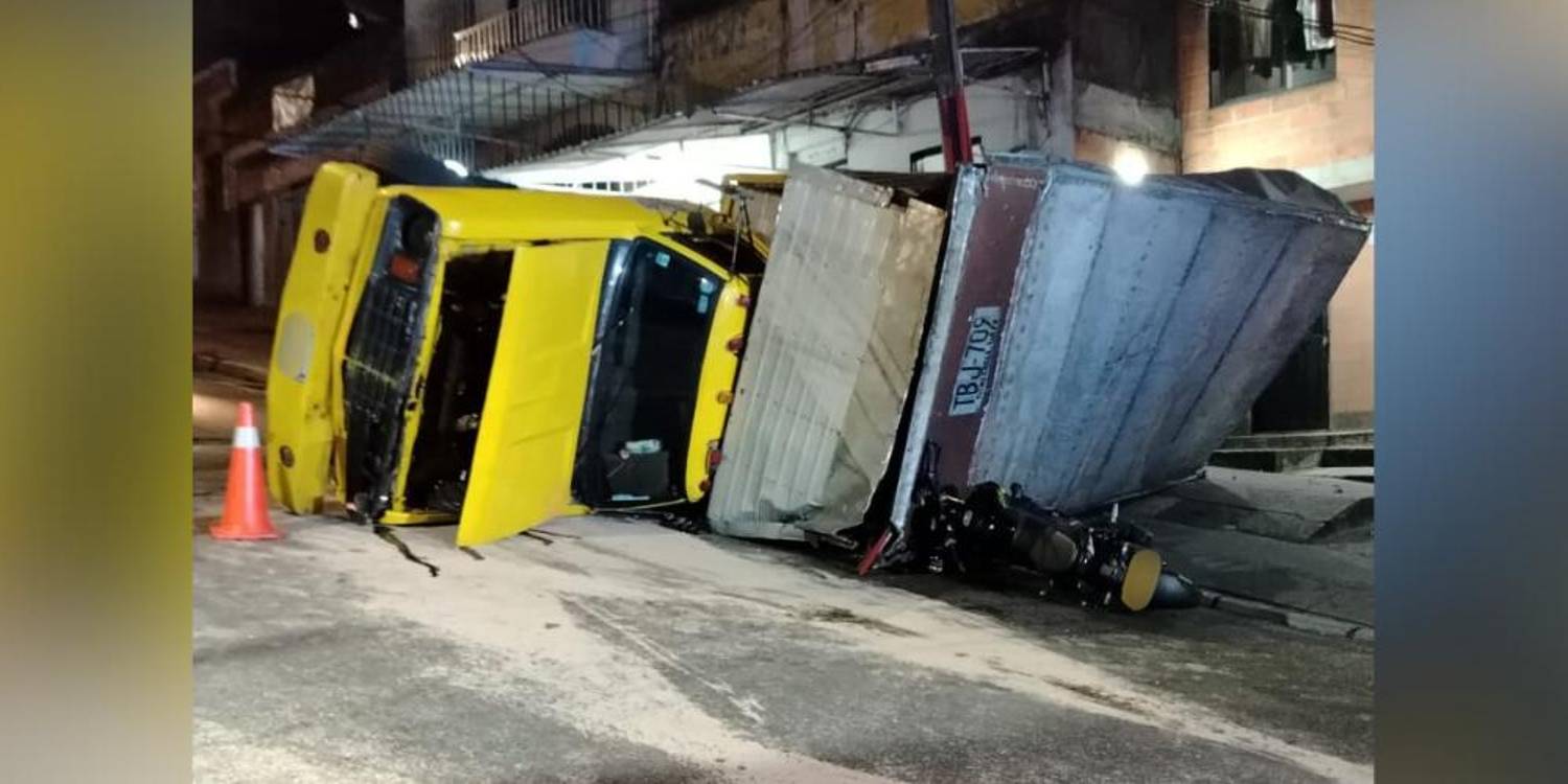En Manrique hay varias vías que parecen desafiar la gravedad, y es que la geografía de montaña ha llevado a construir en lomas que retan cada día hasta a los conductores más experimentados. Este fue el caso de una volqueta que terminó volcada cuando intentaba subir por la calle 80 con 45.