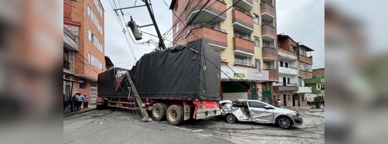Un fuerte accidente que ocurrió en la madrugada de este viernes, 28 de marzo, generó caos en el municipio de Caldas. Un tractocamión, que circulaba en contravía, impactó contra 8 postes de electricidad en el barrio Los Cerezos, causando la interrupción del servicio eléctrico en al menos 150 viviendas, así como daños en varios vehículos y motocicletas estacionadas.