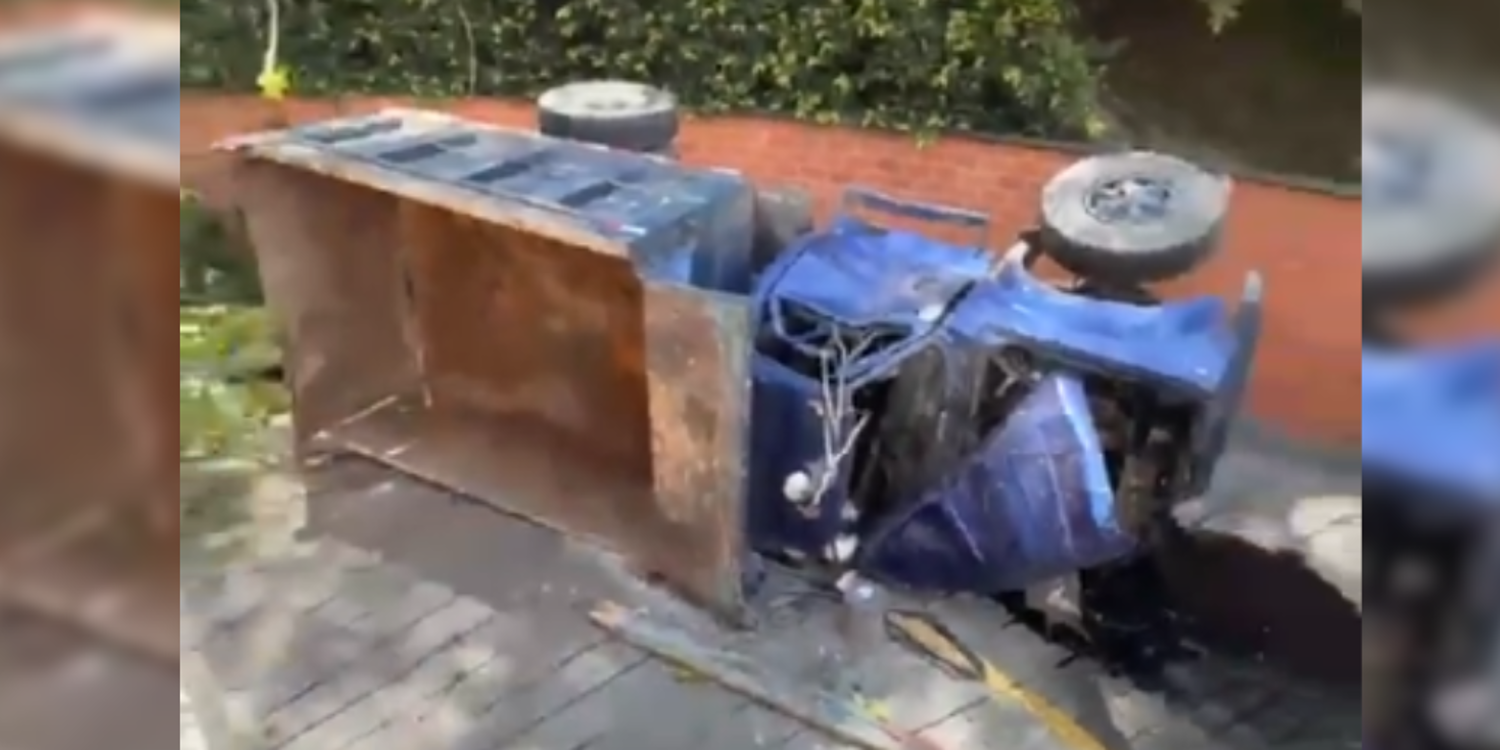 En la mañana de este sábado, 6 de septiembre, se registró un aparatoso accidente de tránsito en el barrio Loreto. Una volqueta terminó volcada en el parqueadero de un conjunto residencial.