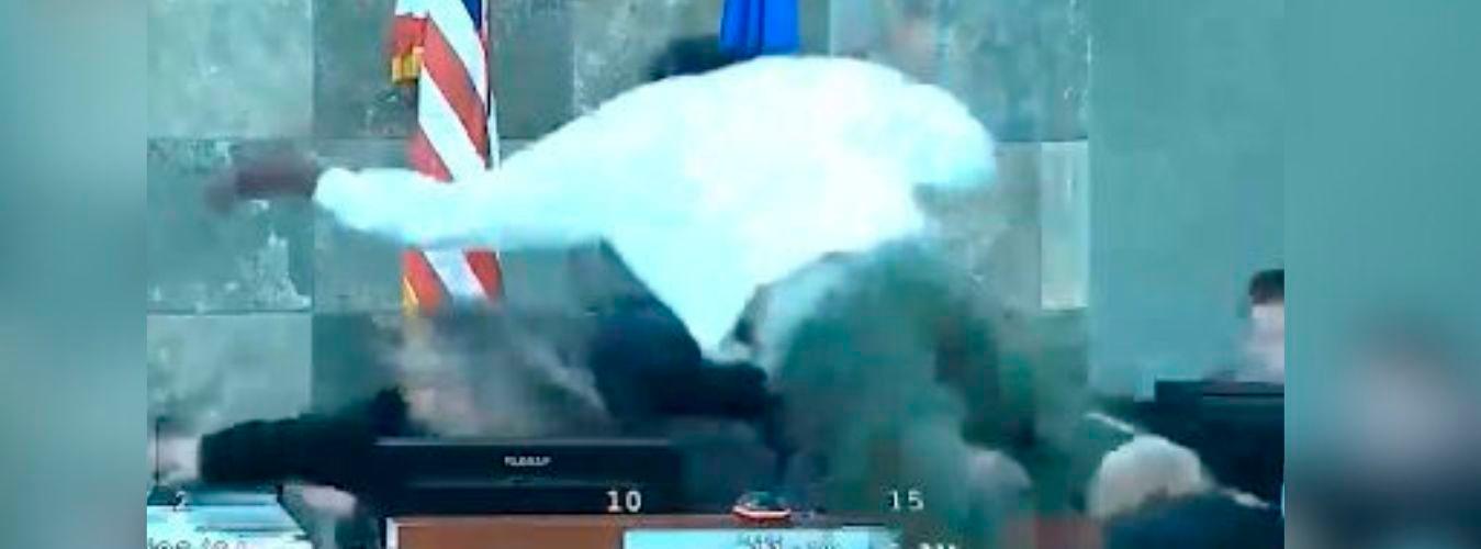 “Que jodan a esa perra”, gritó el hombre mientras esquivaba el personal de seguridad y pasaba por encima de su escritorio. Apenas la jueza vio la reacción del hombre, intentó hacerse a un lado, pero terminó cayéndose de la silla.