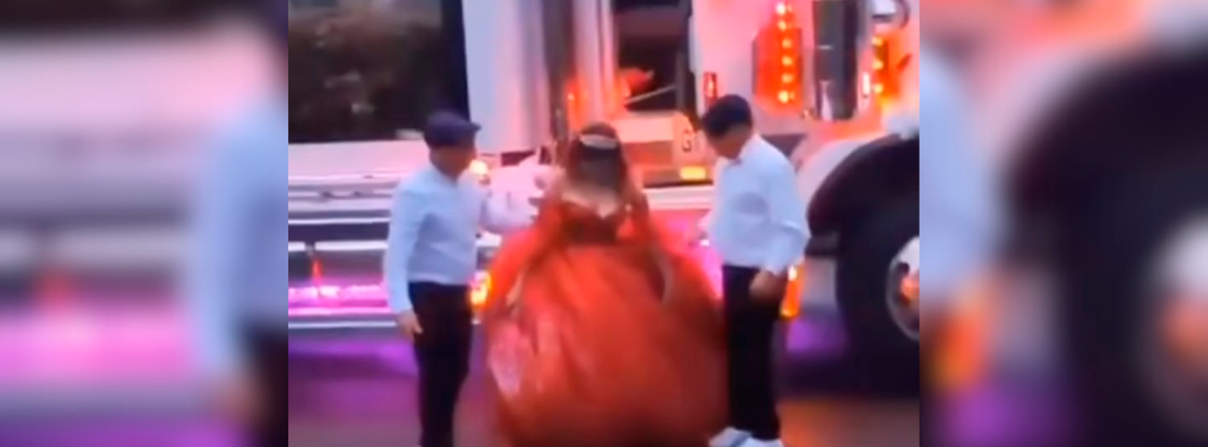 En el video se puede ver la joven con su pomposo vestido rojo bajándose de tremenda tractomula y, obviamente, siendo el centro de atención de quienes la estaban esperando.